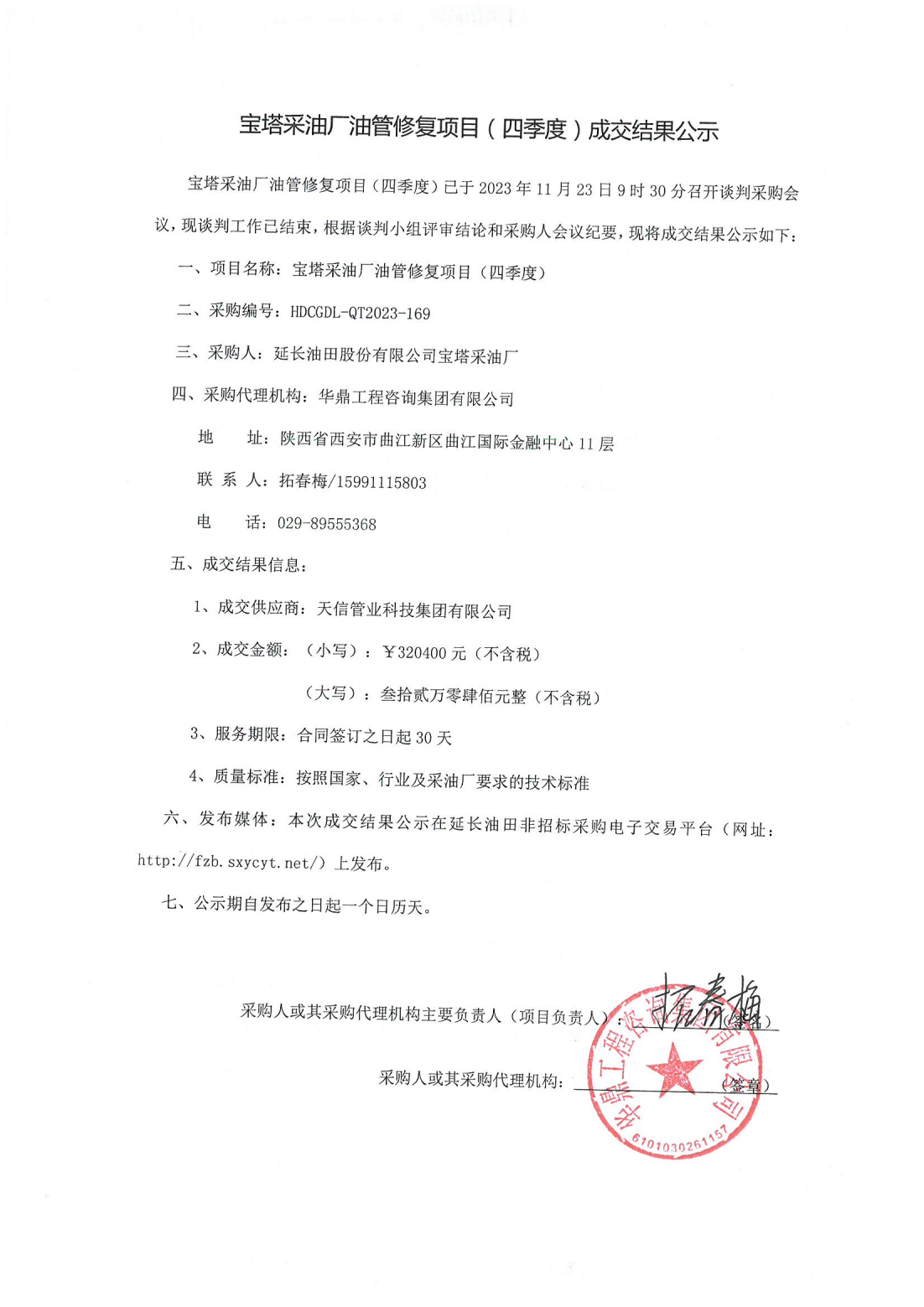 寶塔采油廠油管修復項目(四季度)成交結果公示